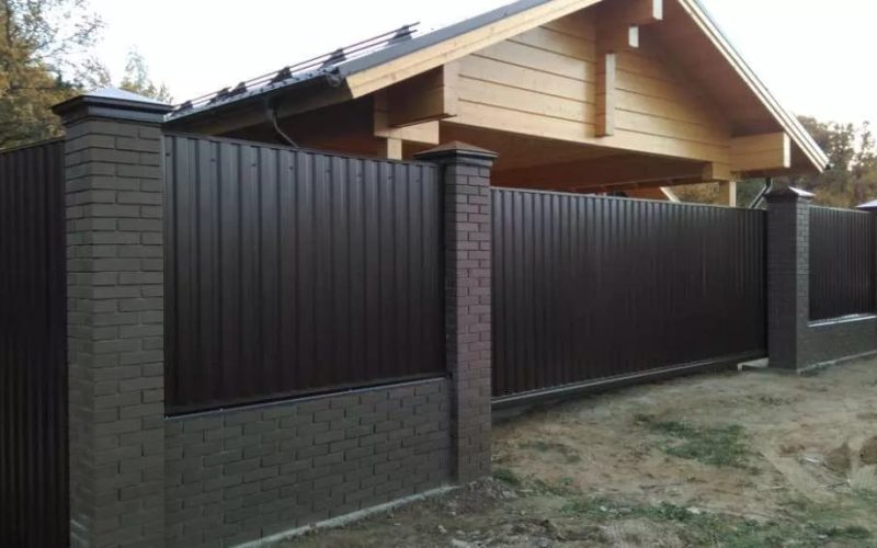 Заборы из металлопрофиля с кирпичными столбами